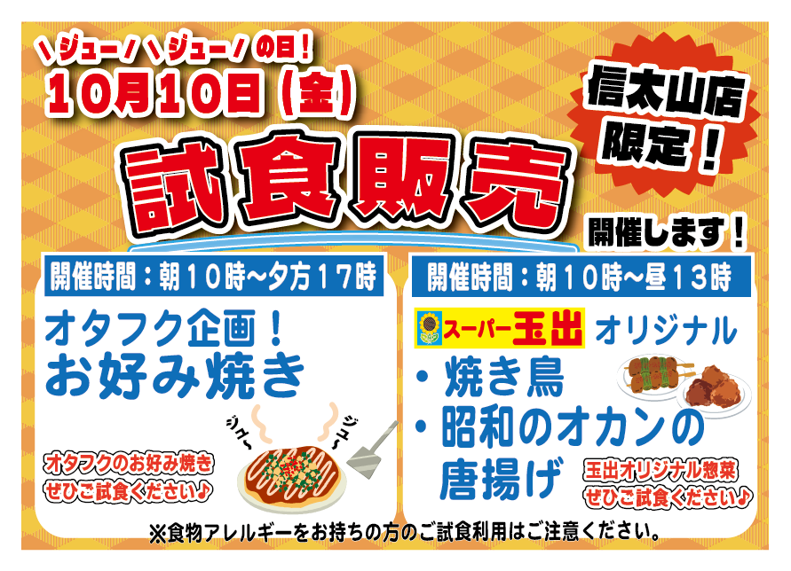 10/10(金)朝10時~スーパー玉出信太山店で試食販売を開催します。